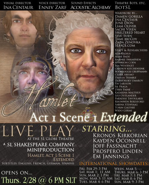 This mini-production performance of Hamlet, Act 1, Scene 1 Extended will be enacted in live voice by professional actors who are represented on-stage by avatar characters dressed in historically accurate wardrobe. In-world technological innovations such as sculpted animated faces, clever techniques in texture and sound effect preloading and novel methods for audience participation and interaction are a few extra bells and whistles of the event. Closed-captioning will be provided by subtitles in English, French, German, and Spanish. HUD's to facilitate the audience experience will be distributed on-