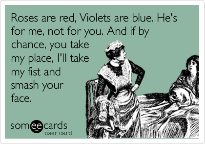 For the second time today, I've come across this attitude: Noirbettie pointed on her blog to a new Miley Cyrus recording, of Dolly Parton's Jolene, which expresses a simular sentiment. (Not that I think Noirbettie shares this view, she just pointed to the song.) Both the card and the song put forth the idea that a man can be stolen from one woman by another. While the situation of one lover leaving the other is common, it's the idea that the man is an object that can be stolen that I object to. It reduces him to a vessel that